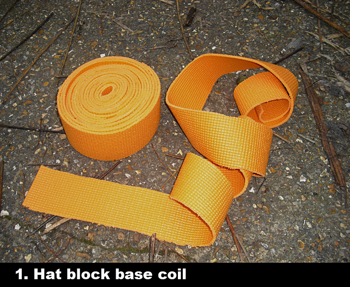 - Make a fold about 2.5" along the strip, then tightly coil the strips around, adding new strips as needed to create an oval the same size as your head measurement (picture 1, hat block base coil). Use plenty of parcel tape as you go to stop the coil springing open