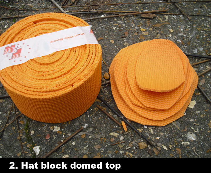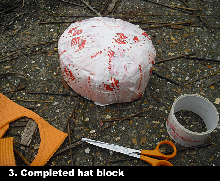 - Wrap the whole hat block with parcel tape to create a complete block (picture 3, completed hat block)