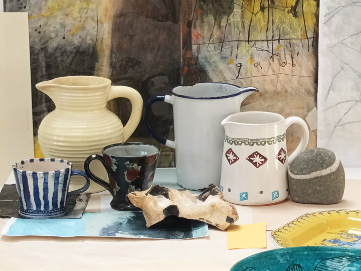 Gather together your resource material. Remember you will be working with this for a week so choose carefully. To begin with you will all need a few simple objects, jug, cup, tea pot or similar with a little variation in shape. Look for the lip of a jug, an interesting handle. You might include a pear, apple or other fruit or vegetable.