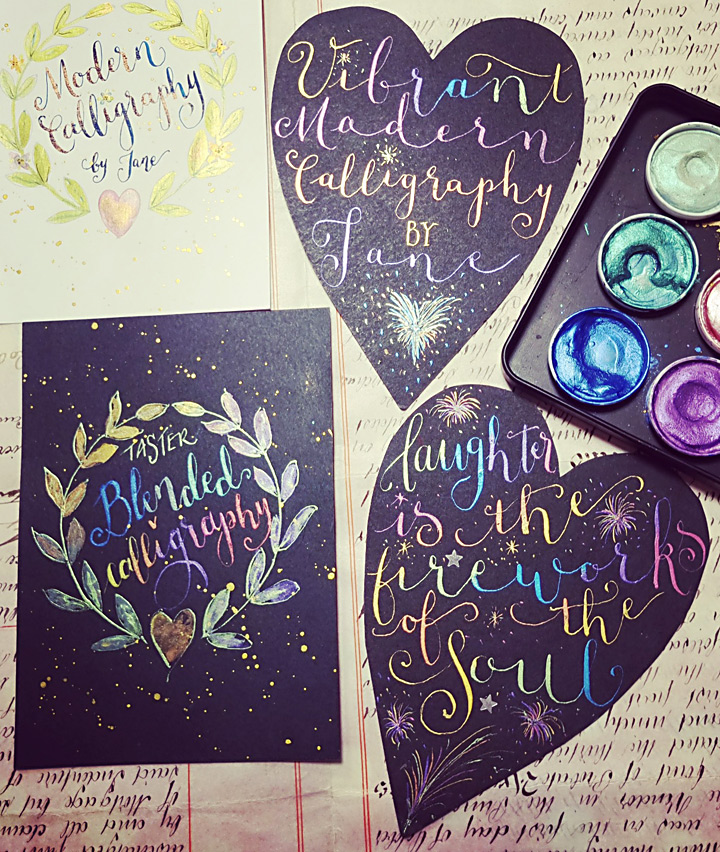 Modern calligraphy is described as wonderful and ‘user friendly’ compared to classic scripts and it is perfect for both left and right handed people. Jane’s new approach to this script is to work with shiny paints that look amazing on dark or black card. She will begin with the basics, teaching you to hold the fine point nib correctly in order to generate the right strokes. You will then work the letters and connecting strokes.