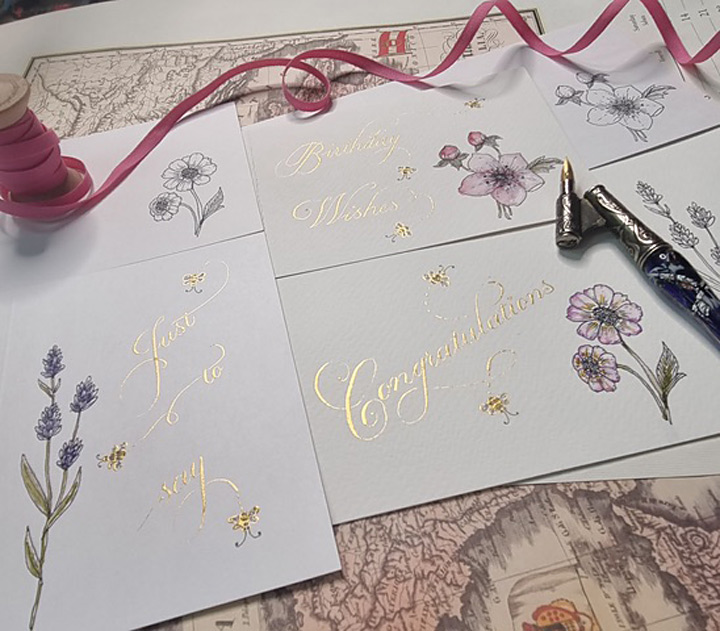 Over the course of two days you will learn how to use a fine point nib and practice the strokes required to construct the alphabet and particularly the letters you choose to make a floral card.