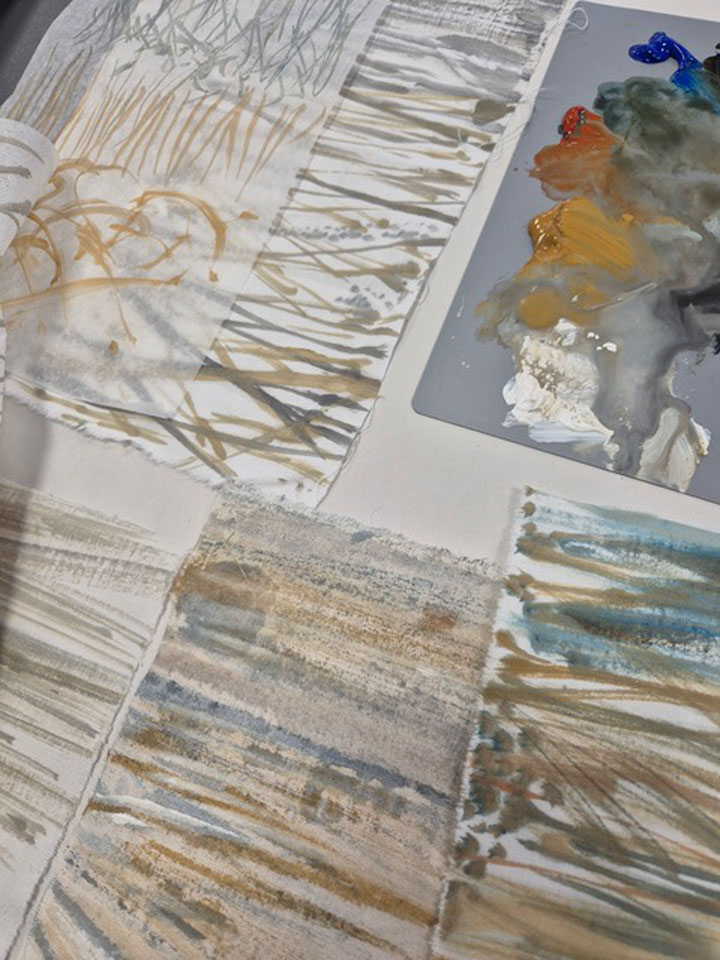 During the course explore the colour in your chosen landscape to create a sense of place. Develop personal visual language creating a selection of cloth and paper surfaces using painterly print and mark making. Fragment the surfaces created, work intuitively through a random system of placement creating arrangements of small abstract collages to work into with hand stitch. Take time to let the work unfold; add layers of harmonious or contrasting colour combinations with hand stitched thread creating subtle textural effects. What would happen if the surface were folded or pleated; over-stitch edges, insert stitch into the ground cloth; follow your own creative pathway to inspire imaginative outcomes.