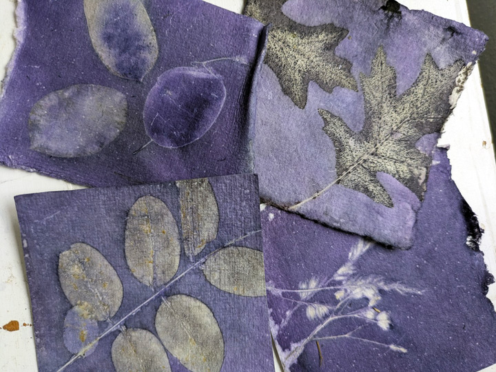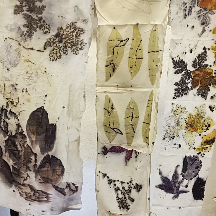 On the second day you will learn how to add a dye blanket to your ecoprinting and further develop skills. Again, you will work on paper and fabric together with logwood dye that will give blue and purple colours and will fill in areas between the leaf prints.