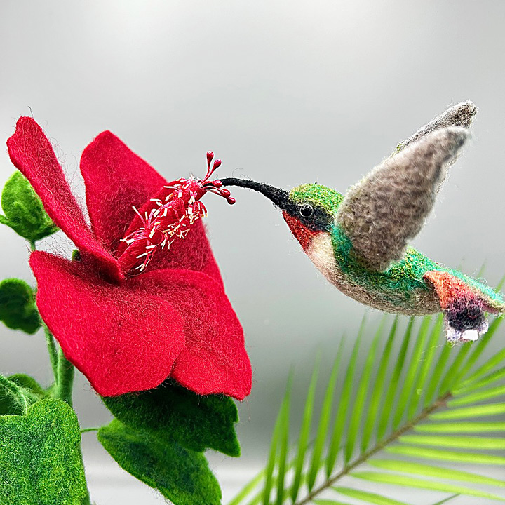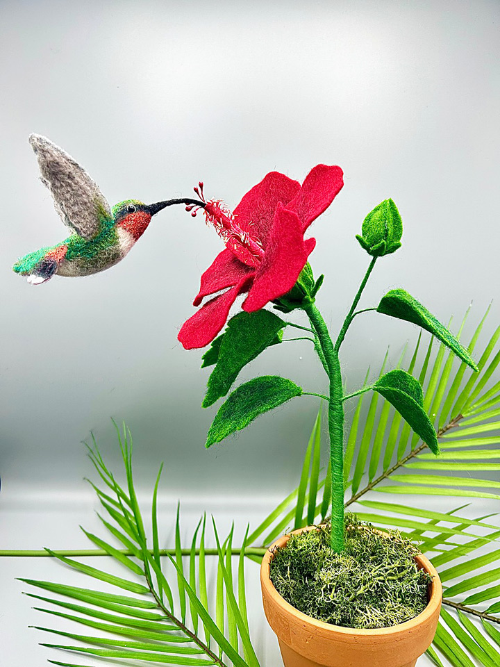 Needle Felted Hummingbird and Hibiscus