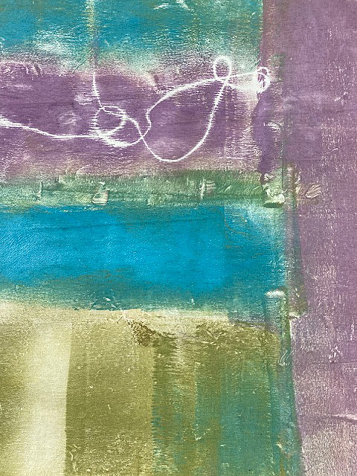 Gel plate printing is a type of monoprinting that uses a soft, flexible, and reusable gelatin-like plate to create unique, layered prints on paper or textiles without the need for a traditional printing press. The process involves applying paint or ink to the plate and then transferring the design onto paper or fabric by pressing the surface onto the plate.