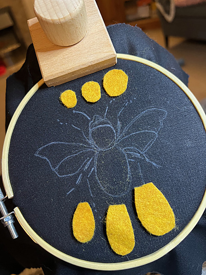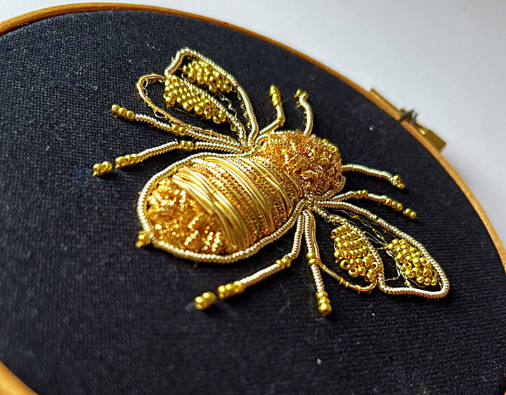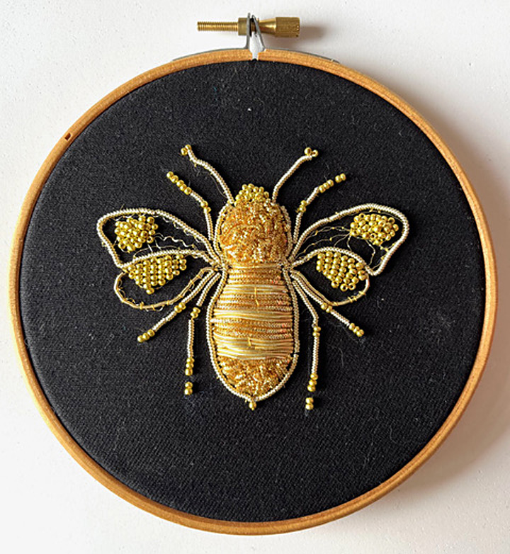 Goldwork uses metal threads to create surface decoration and if you have always wanted to try it, but have been slightly intimidated by the precision of the techniques, this is an opportunity to join Sarah for a fun day of stitching. This project is to create your very own Golden Bumble Bee, hand stitched throughout, in a five inch embroidery hoop.